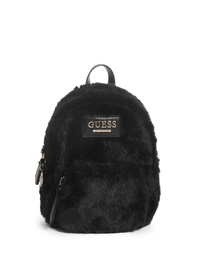 Faux-fur mini backpack crossbody complete with logo hardware, a front zipper pocket and chain-trim strap.