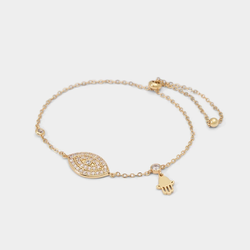 Evil-eye and Hamsa charms thread through a gleaming gold chain, a tiny bouquet of sparkle catching light as the centerpiece of chic bracelet shine. Layer it with a stack of bracelets for brunch, or cinch it around a blazer for a night-out look.
