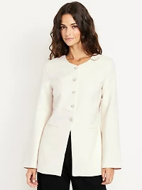 collarless neckline bracelet-length sleeves button front welt pockets vented center front fitted hits at hip models are approx. 5'9" and wear sizes s (4), l (12), and xl (18)dry clean .