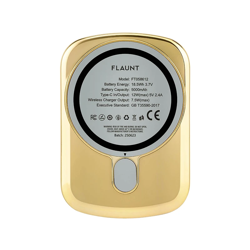 Power up in style with the FLAUNT 5,000 mAh Wireless MagSafe Battery Pack. Designed to be both sleek and lightweight, this portable charger easily snaps into place with its strong built-in MagSafe magnet, delivering effortless wireless charging wherever you go. With a 5,000mAh capacity, it provides reliable backup power to keep your device going throughout the day. The slim profile makes it perfect for slipping into a pocket or bag, while the LED battery level indicator lets you quickly check remaining power at a glance. Offering up to 7.5W of wireless output, the FLAUNT MagSafe Battery Pack combines fashion and function—making it the perfect everyday charging companion for home, work, or travel.