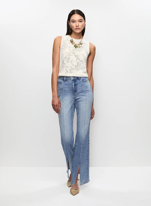 Floral Open-Knit Sleeveless Sweater & Flare Leg Front Slit Jeans
