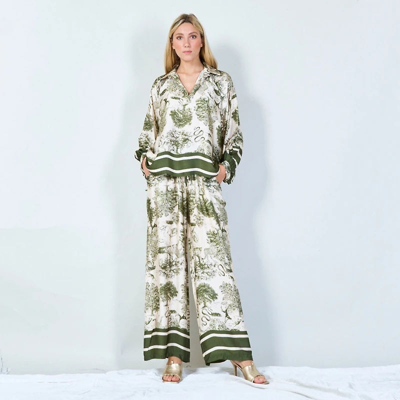 Elegant toile print featuring detailed pastoral scenes