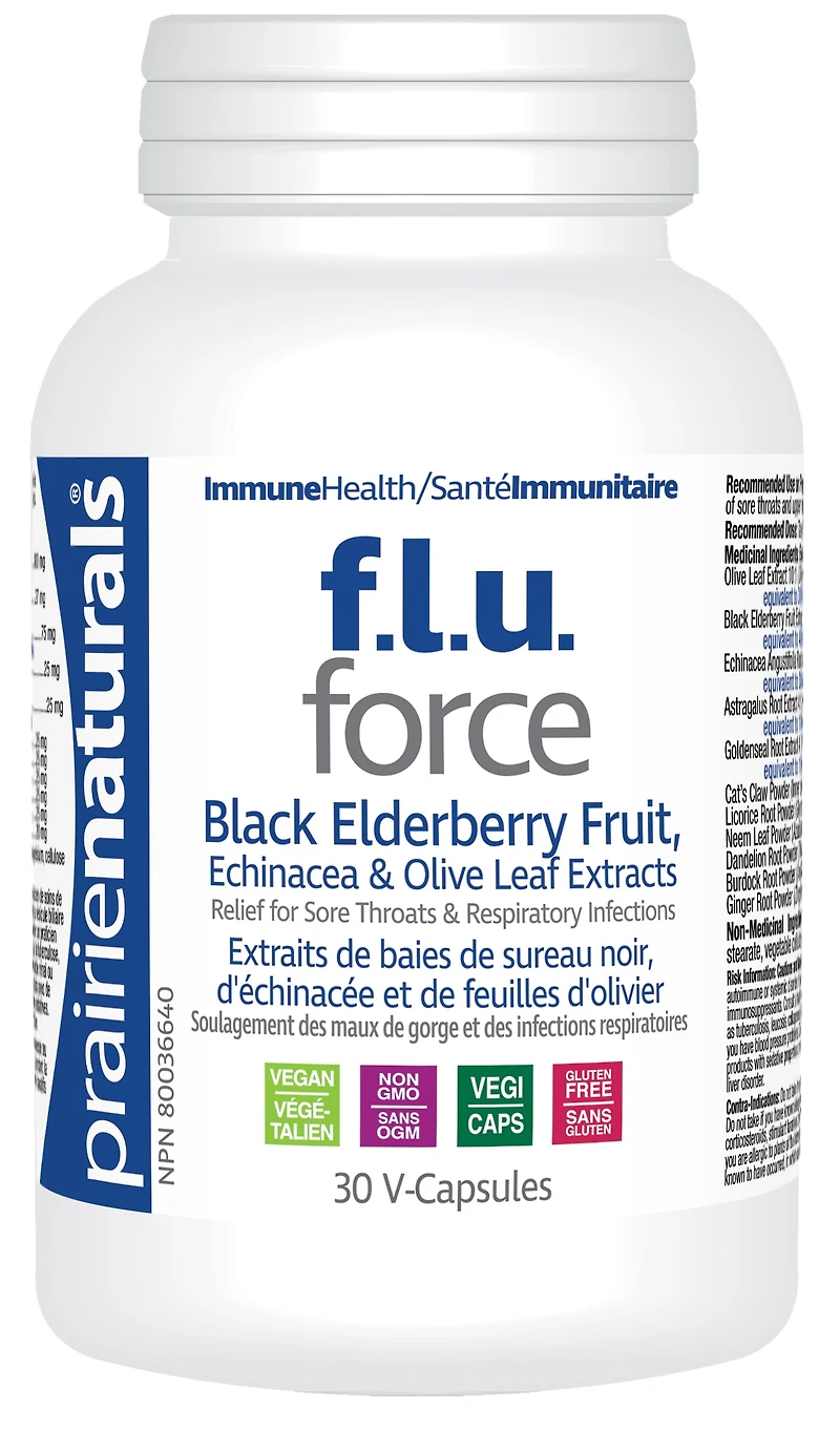 FLU-Force a potent blend of herbs recognized for their anti-viral and immune supporting function. Olive leaf Extract, Black Elderberry & Echinacea Angustifolia Extracts are blended with Astragulus, Golden Seal, Dandelion, Cat’s Claw, Licorice Root, Neem Leaf, Burdock Root and Ginger Root to help relieve the symptoms of sore throats and upper respiratory tract infections.