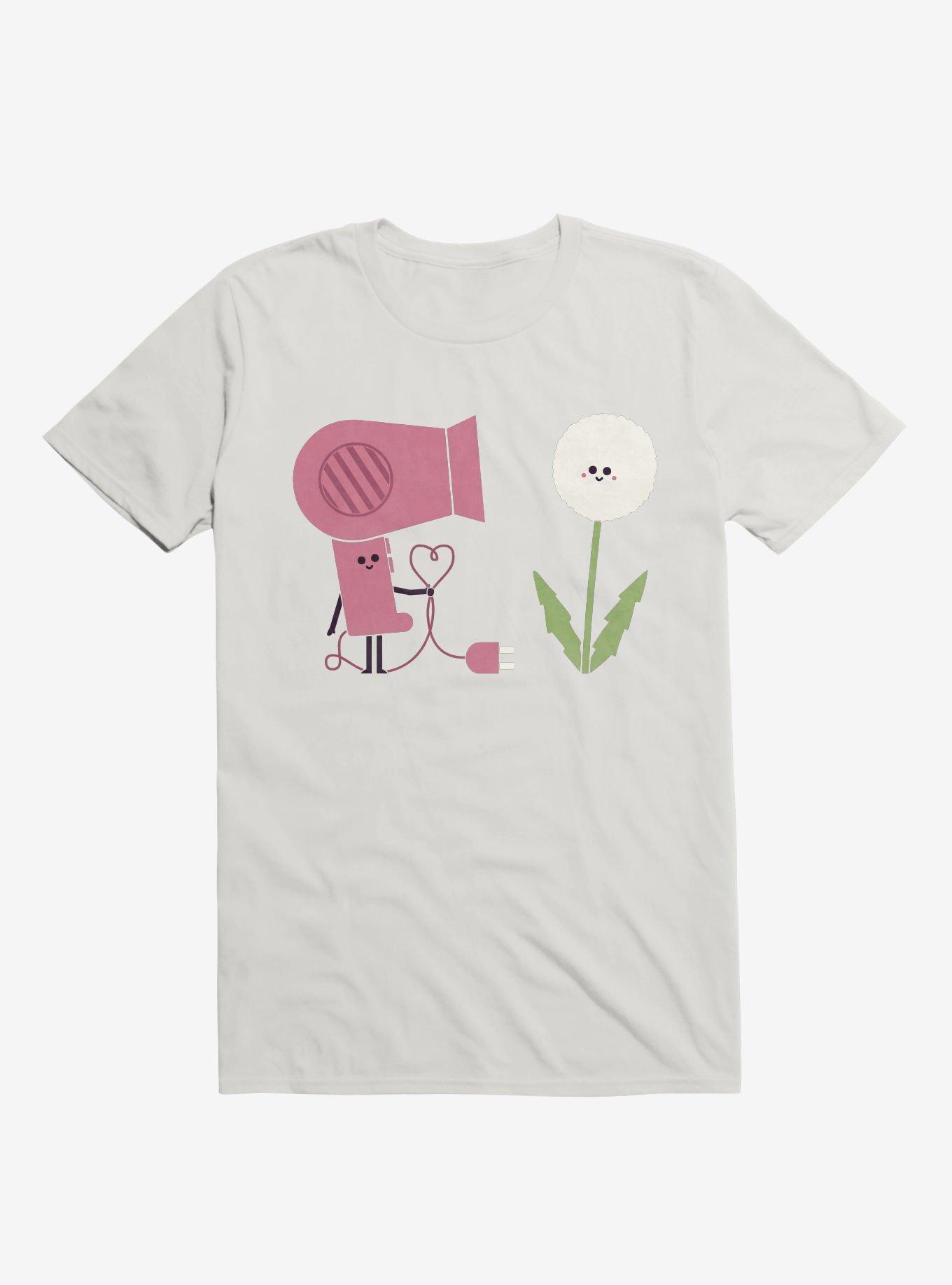 It'll end in tears. This lightweight white graphic tee spotlights the forbidden love between a hair dryer and a red seeded dandelion. Don't blow it, kids. Officially licensed art from handsoffmydinosaur.