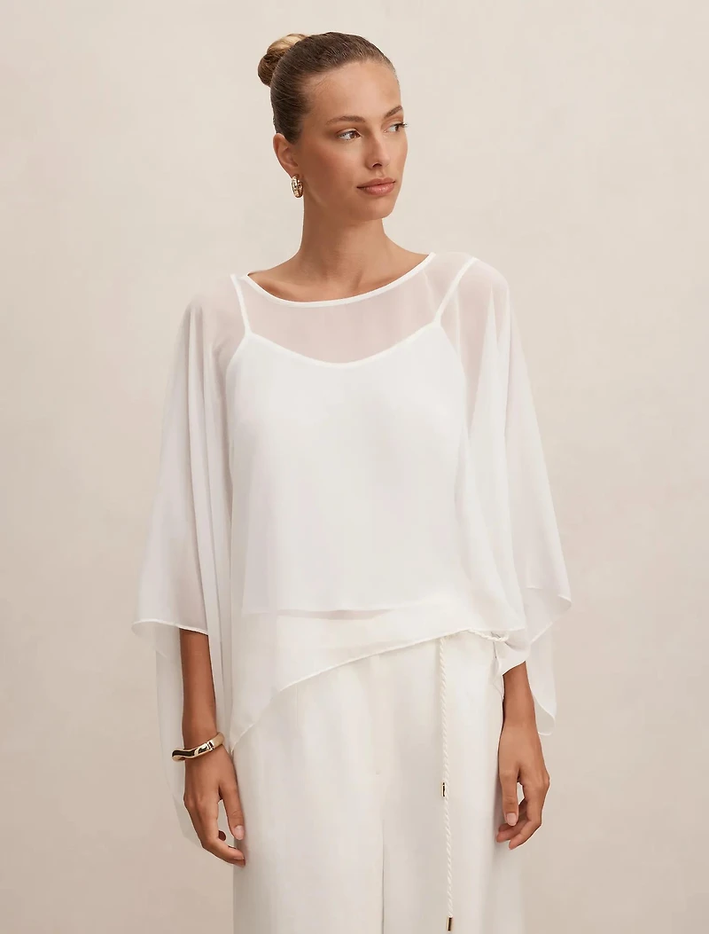 An alluring sheer cape with a detachable cami, pairing with pants and sandals to bring breezy comfort and luxe styling to your beachside brunch dates.