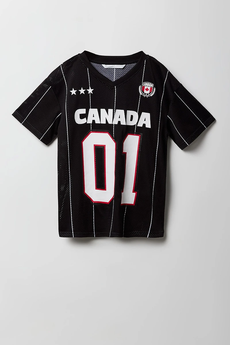 This jersey features mesh material, graphic front, V-neckline, and short sleeves. Pictured Size: 7/8 100% Polyester Machine Wash in Cold Water - Gentle Cycle with Like Colours - Turn Garment Inside Out While Washing - No Bleach - Tumble Dry Low - Low Iron Imported