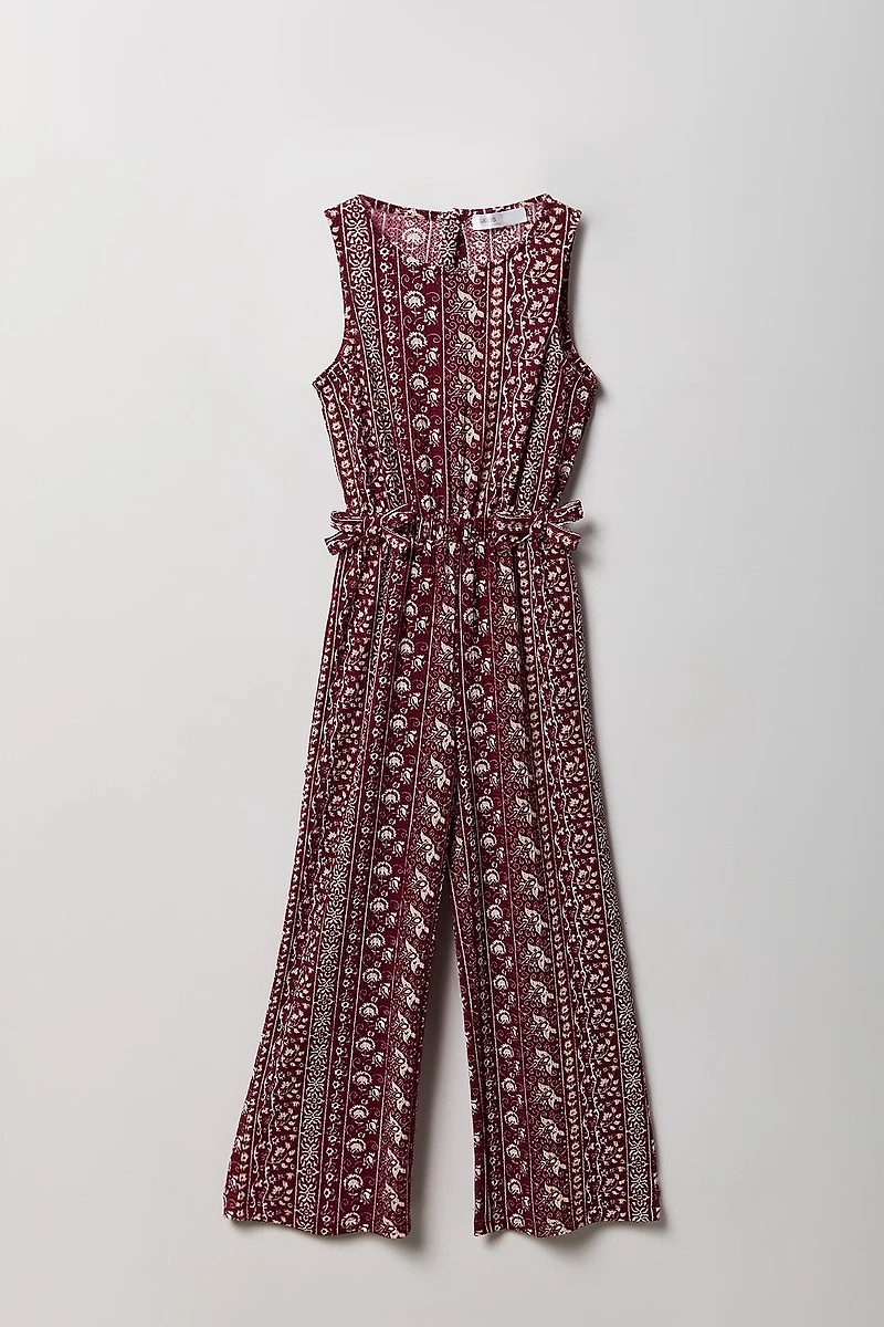 This jumpsuit features crinkle material, all-over print, scoop neckline, sleeveless cut, bow front, and button-up back.