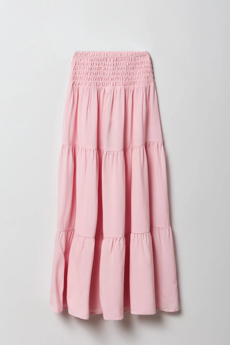 This skirt features smocked elastic waist, tiered construction, and maxi length.