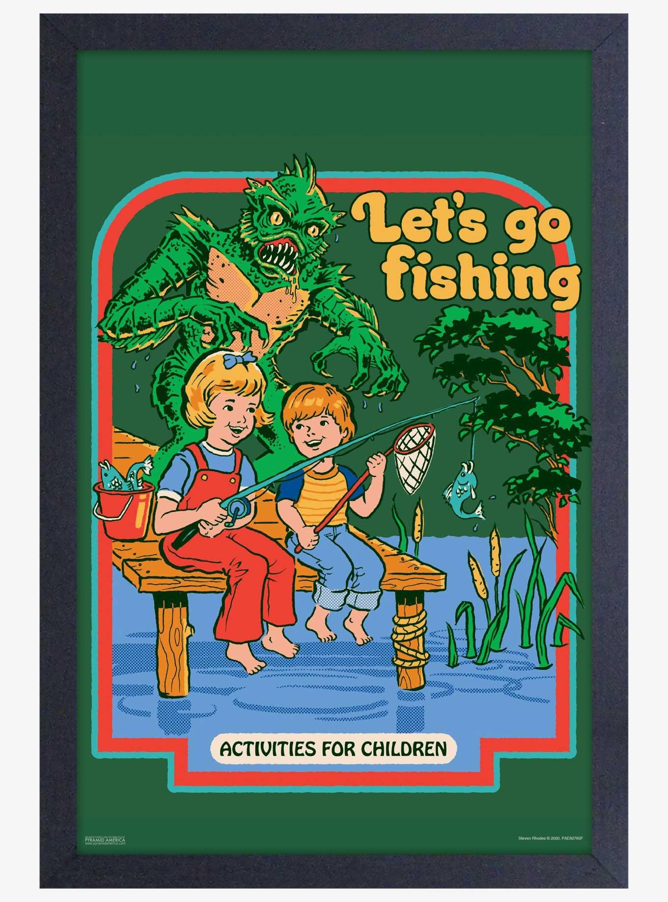Bring good wall art to any room in the house with this high quality framed Let's Go Fishing poster print! Premium 11" x 17" print is framed to 13" x 19" and coated with a protective clear gel, which not only makes it super durable - it gives it that "movie screen" texture, too. Instantly hang your new work of art and enjoy Steven Rhodes' creepy creation on your wall for years to come! Item cannot be shipped to P.O. Boxes
