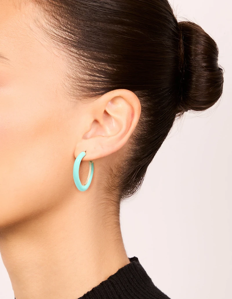 Bring a splash of colour to your look with these Gold Aqua Enamel Irregular Hoop Earrings. These fun enamel hoop earrings feature a playful irregular hoop shape and a fresh aqua finish that pops against the gold tone. Perfect for weekends, parties or a night out, these fashion earrings style easily with a slip dress, a blazer and jeans, or a simple tee. Lightweight and eye–catching, they’re your new go‑to gold hoop earrings when you want effortless, curated style with a cool, modern twist. Material: Enamel Colour: Gold, Blue Dimensions: Length 30 mm x Width 3 mm