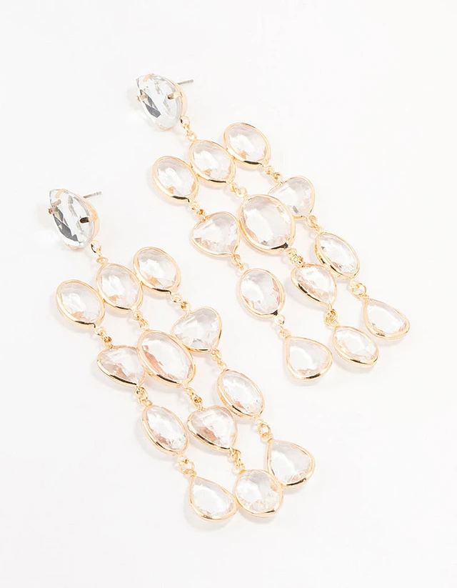 Gold Clear Crystal 3 Row Drop Earrings