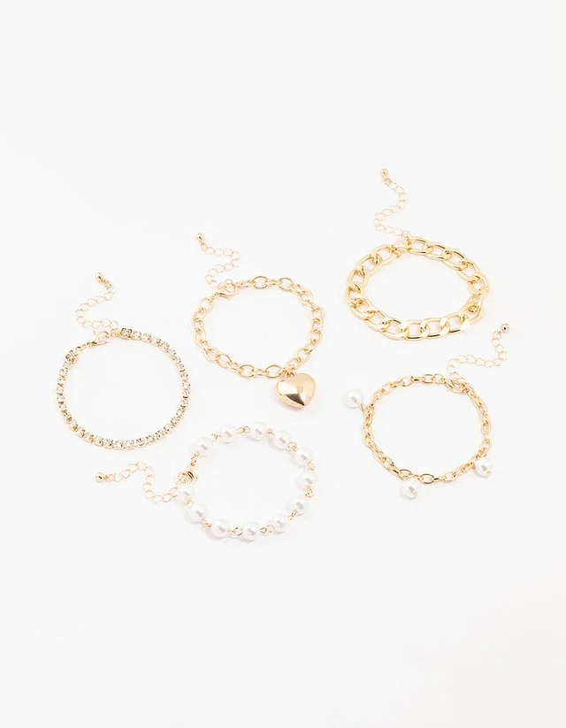 Gold Pearl & Puffy Heart Bracelets 5-Pack