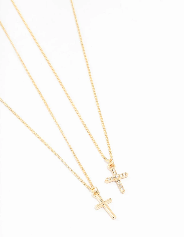 Gold Plain & Diamante Cross Necklace 2-Pack