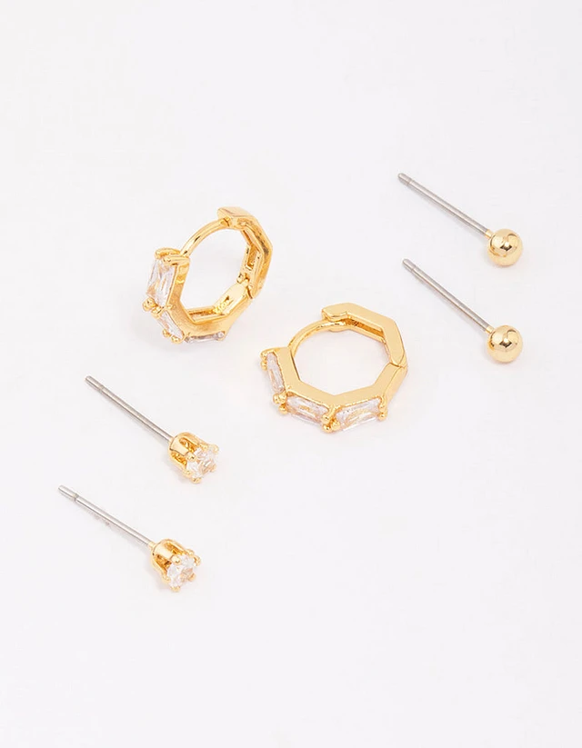 Gold Plated Brass Baguette Stud & Huggie Earring Pack