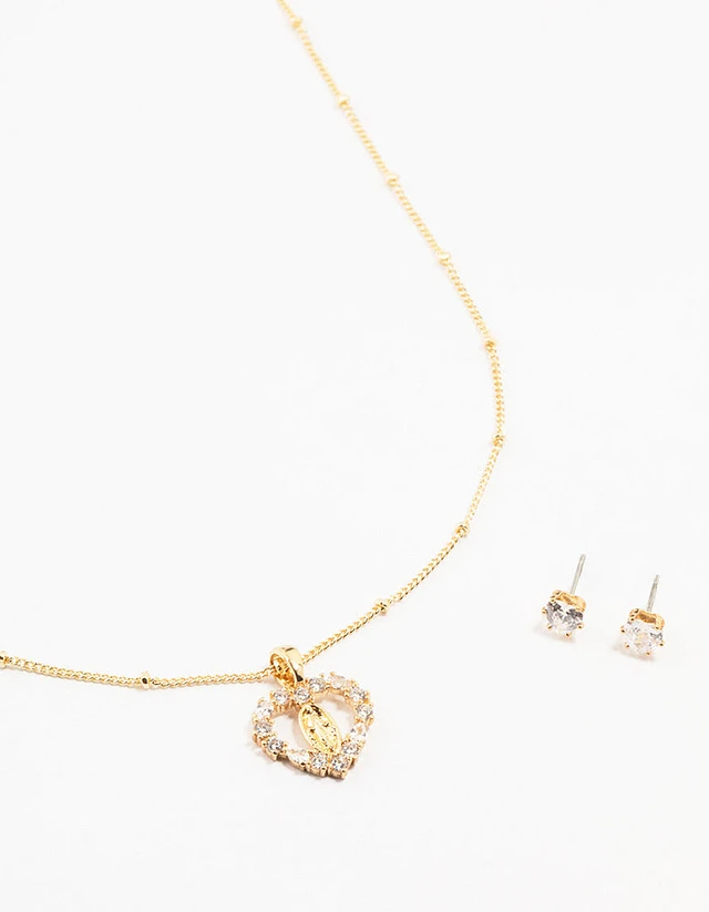 Gold Plated Diamante Heart Mary Necklace & Stud Earrings Set