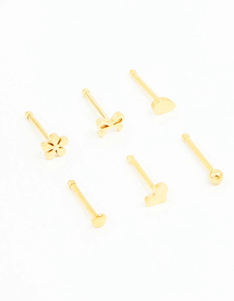 Gold Plated Surgical Steel Heart, Bow & Flower Nose Stud 6-Pack