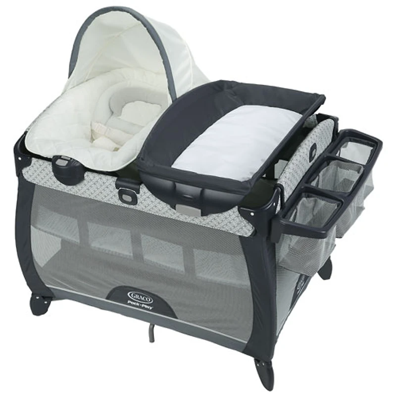 Quick Connect design makes it easy to attach or remove components with a one-step click of a button for convenience, portability, and easy packing up Portable lounger lets you keep your little one cozy and near with one-click removal from the playard Removable full-size bassinet for your baby to rest at home, or take it with you for use when you're away Removable diaper changer with wipe-clean fabric for quick changes, keeping everything clean and sanitary, and easy packing up of the playard Integrated storage organizer for essentials like diapers, wipes, clothing, and more so they're always at your fingertips when needed