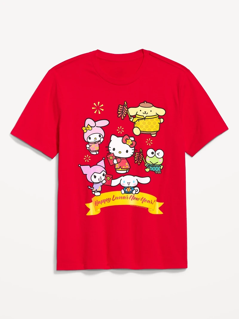 rib-knit crew neck short sleeves licensed graphic © 2025 SANRIO CO. LTD. Used Under License relaxed fit hits below waist t-shirt uses our standard men's sizingmachine wash according to the care instruction label .