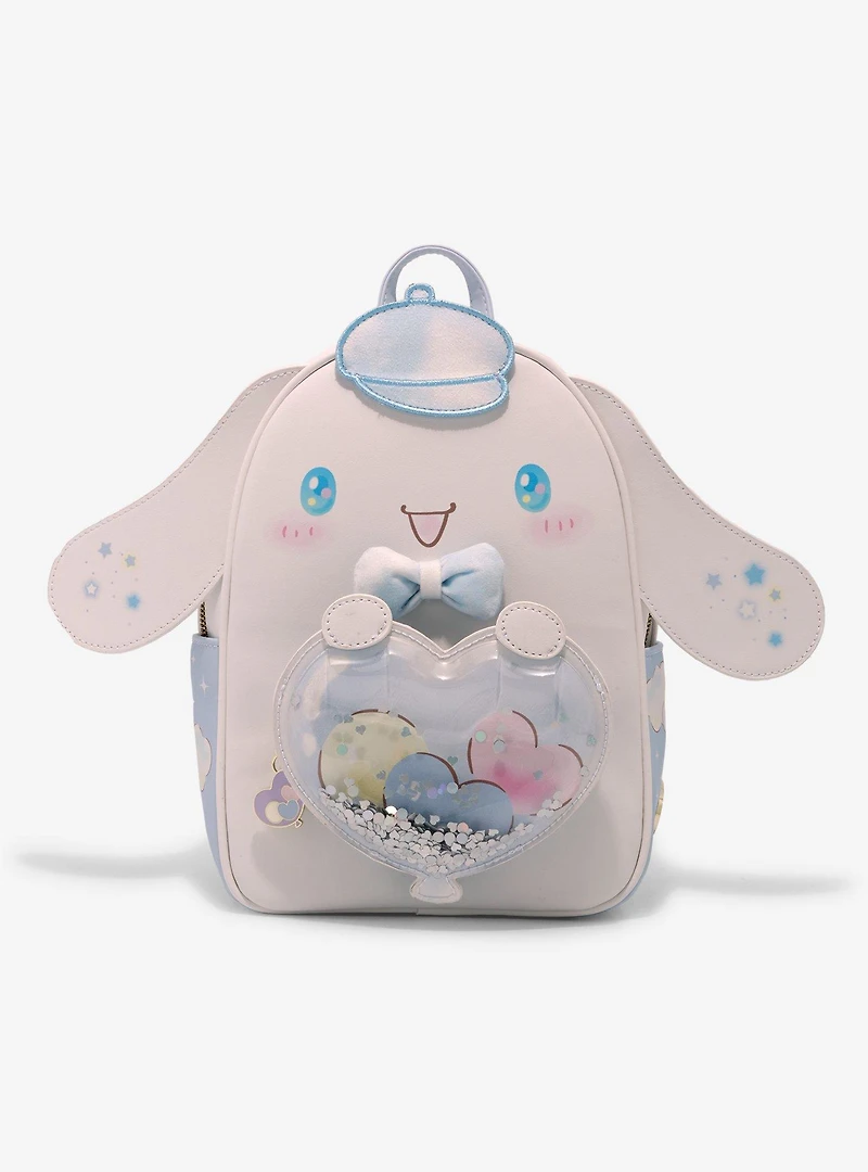 Pack your essentials into this dreamy backpack before you take to the skies! This Sanrio mini backpack features Cinnamoroll with 3D figural ears and a textured cap and bow on, holding onto a heart-shaped balloon front zipper pocket that has a matching balloon charm. Comes with side pockets and interior zipper pocket. Please note: Cardholder sold separately.