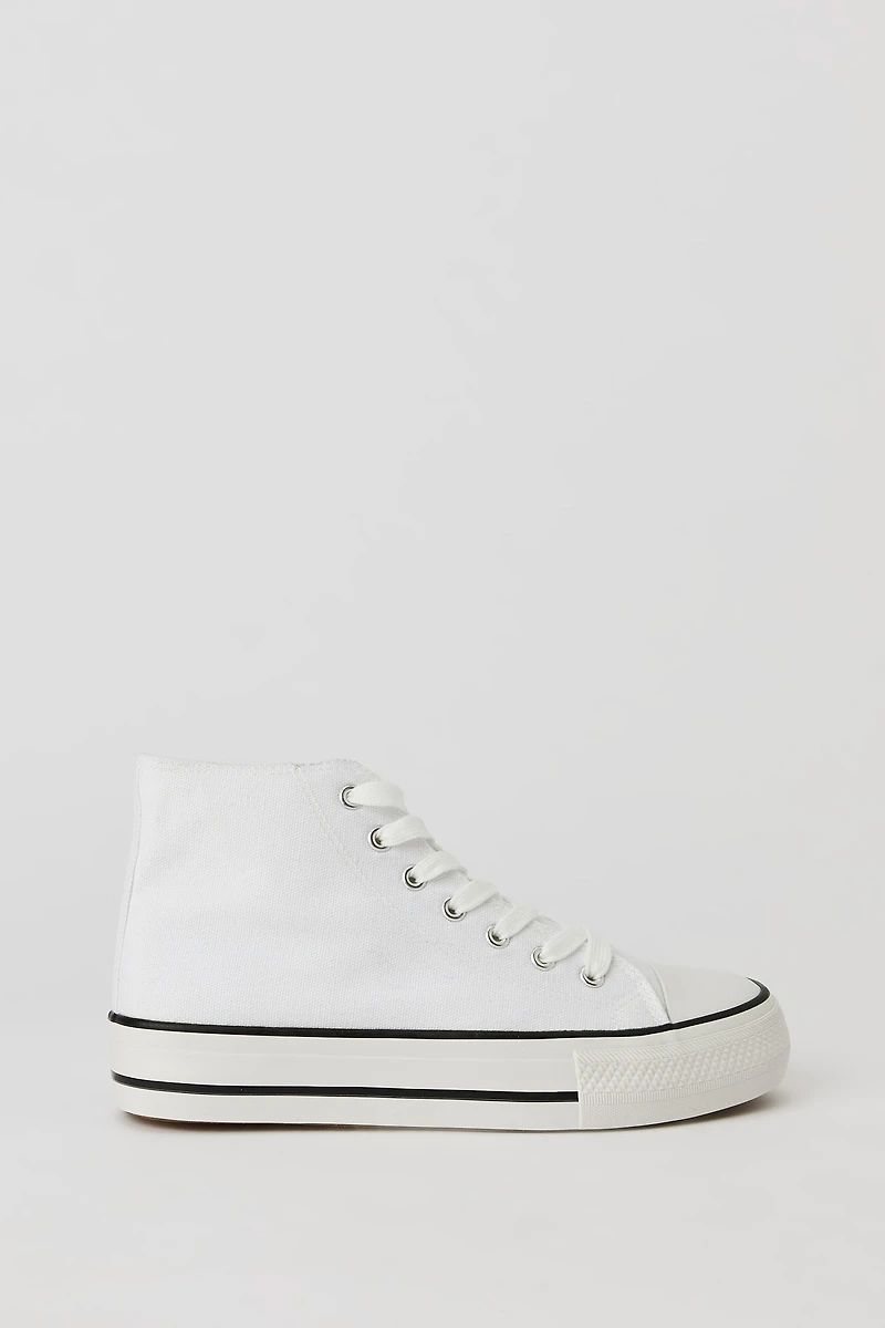 This shoe features canvas material, high-top, lace-up front, and platform sole.