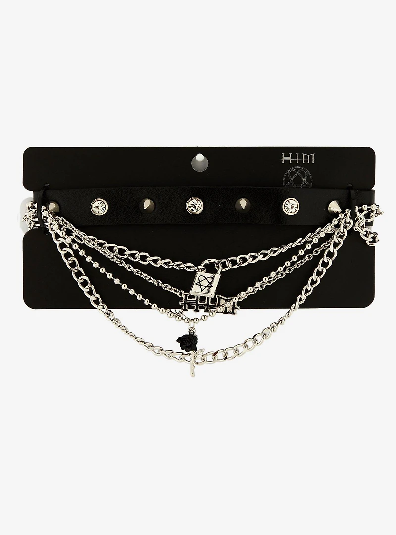 This HIM necklace set is just waiting to be your sweet six six six! This silver-tone set features a "HIM" nameplate, their heartagram on a locket, a black rose necklace and a layering piece.