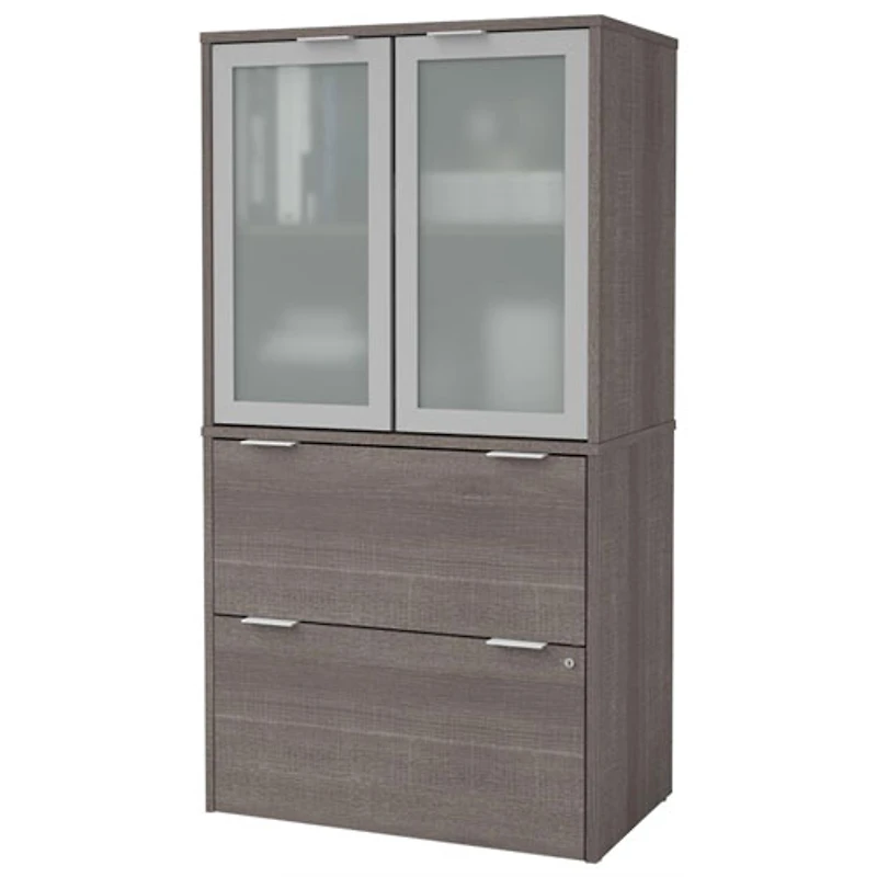 Part of the i3 Plus collection and pairs with other pieces in the set (sold separately) for a coordinated look 2 locking file drawers with smooth-opening ball-bearing slides provide a filing system for letter and legal-size documents Glass door cabinet features an interior fixed shelf for concealed storage Contemporary style blends effortlessly with existing home or office decor Maximum shelf capacity: 10kg (22.05lb.) Proudly crafted in Canada Constructed from high-density commercial-grade particle board laminated in bark grey and frosted glass for long-lasting strength, durability, and beauty Meets or exceeds ANSI/BIFMA performance standards Requires 1.5 hours for 2 adults to assemble using a screwdriver and hammer Overall dimensions: Width: 76.45cm (30.10"); height: 144.27cm (56.80"); depth: 46.23cm (18.20")