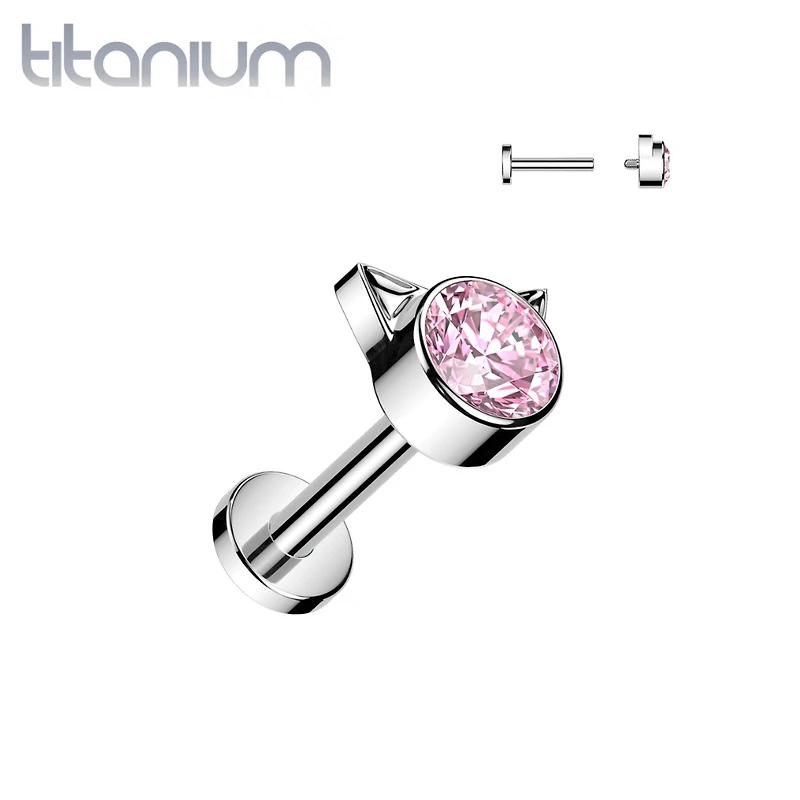 This internally threaded labret made of implant grade titanium has a cat ear cz gem top and a flat backing that's perfect for various piercings. It's comfortable and can be worn on the tragus, cartilage helix, lip, and conch - just be sure to select the right length!