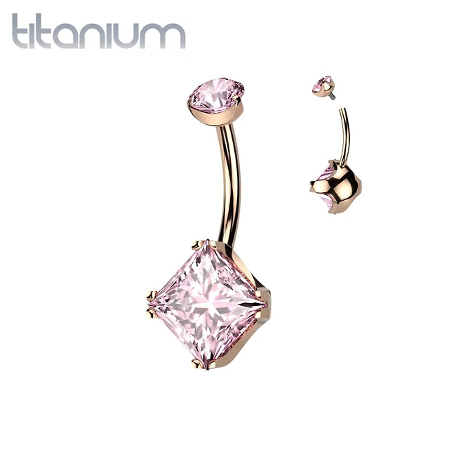 Implant Grade Titanium Rose Gold PVD Pink CZ Simple Square Gem Belly Ring