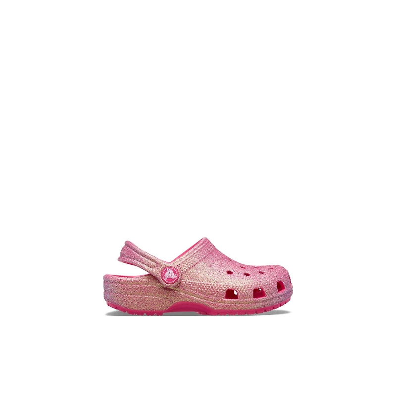 A fun new iridescent glitter treatment provides added style to this version of the iconic clog. The sparkly glitter changes color when you look at it from different angles, making these extra fun, and Croslite™ foam construction keeps them light and easy to wear. Also available for adults and toddlers, so you can get matching pairs for a fun full family moment. Grounded in comfort, spiked with personality. Sparkle on! Customizable with Jibbitz™ charms.