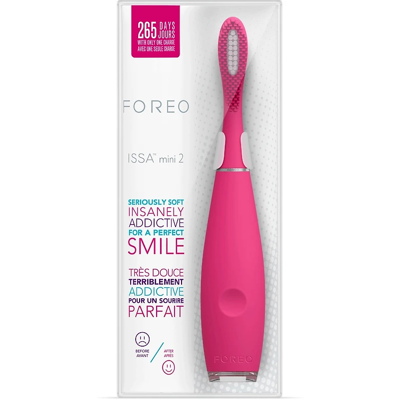 ISSA mini 2 is an electric toothbrush created for kids (aged 5+) and adults who prefer smaller brush heads. A fun and bold silicone brush now features twice the power of Sonic Pulse Technology and a hybrid brush head to brighten, whiten and polish your smile. The hybrid brush head’s inner PBT polymer bristles remove plaque build-up while the outer silicone bristles comfortably massage the gums and inhibit over-brushing, preventing gum recession and damage to tooth enamel.