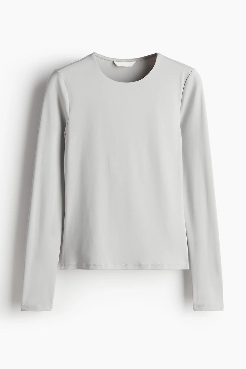 Fitted top in stretch jersey. Round neckline and long sleeves. Partly lined.