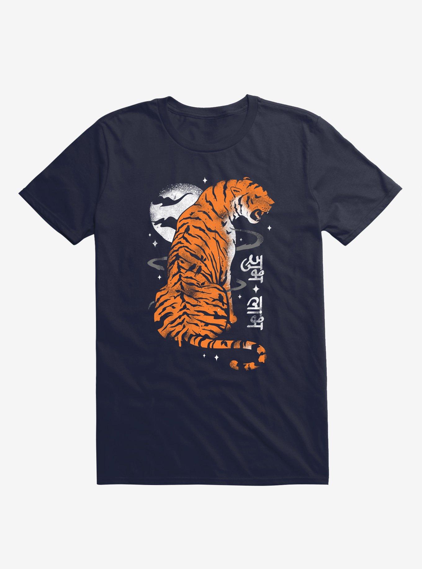 Look closely. This lightweight navy blue tee features a tiger whose stripes include silhouettes of birds on branches. A moon and stars fill the background, and the lettering translates to "prosperous." Officially licensed art from Grant Stephen Shepley.