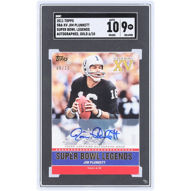 Jim Plunkett Oakland Raiders Autographed 2011 Topps Super Bowl Legends Gold #SBA-XV #6/10 SGC Authenticated 9/10 Card