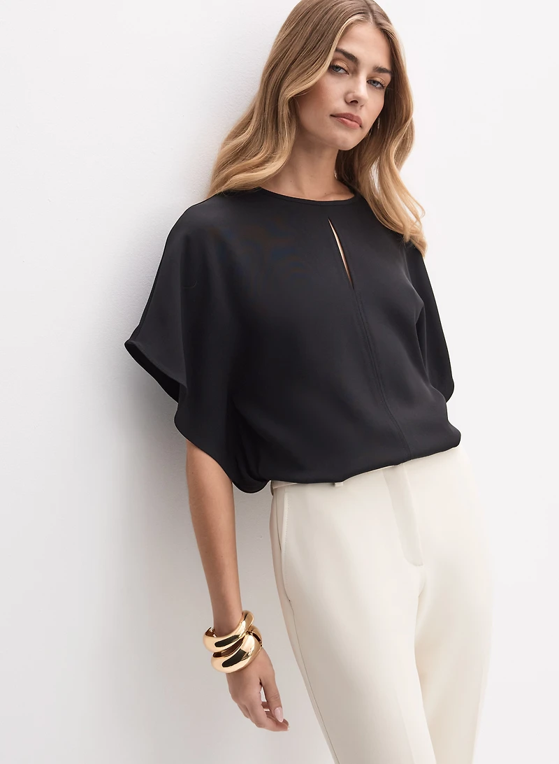 Our blouse by Joseph Ribkoff features a relaxed batwing sleeve design paired with a subtle crew neck and a keyhole detail for a modern touch. Pair it with tailored trousers and minimalist earrings to elevate your look with effortless sophistication.