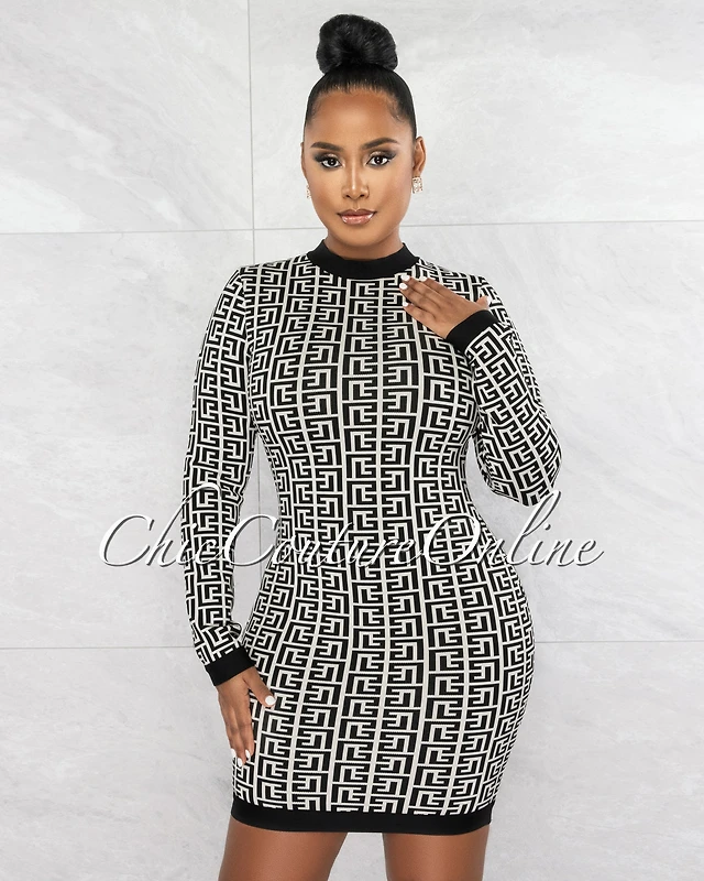 *Keaton Black Cream Fret Print Long Sleeves Bandage Dress
