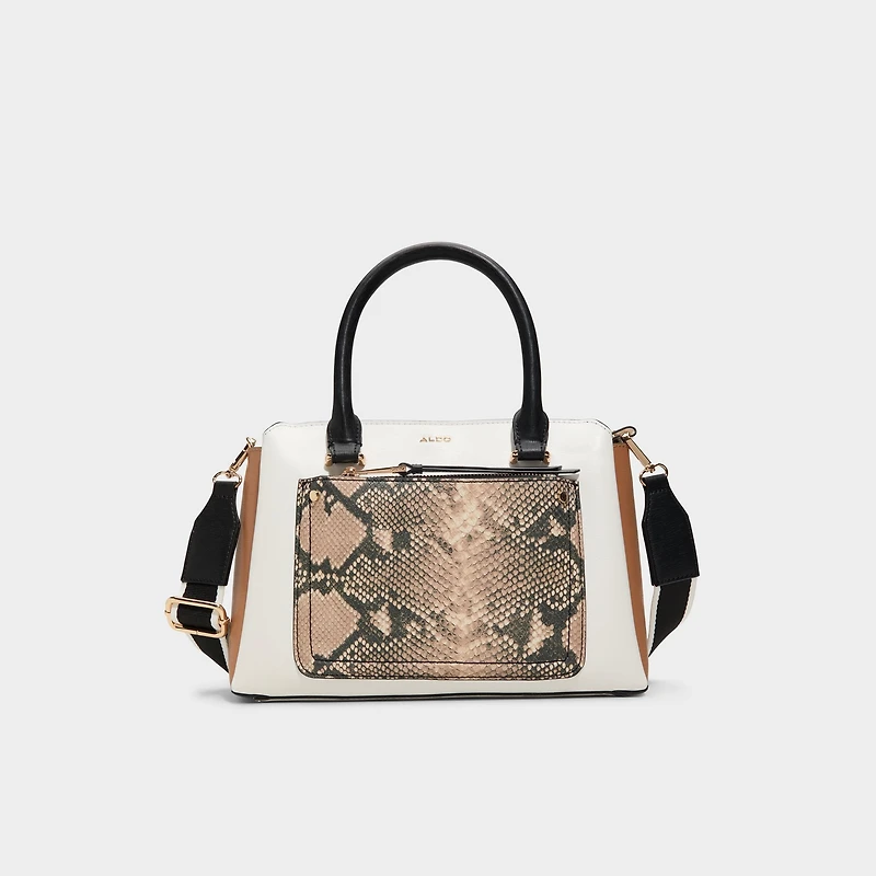 Bold snake-skin front pocket punctuates a crisp white leather silhouette, framed in gold-tone hardware for a look that's sleek, confident, and ready to take you from boardroom to dinner with ease. Carry it to meetings or sling it over denim for weekend brunch, finishing polished days and relaxed nights with quiet confidence.