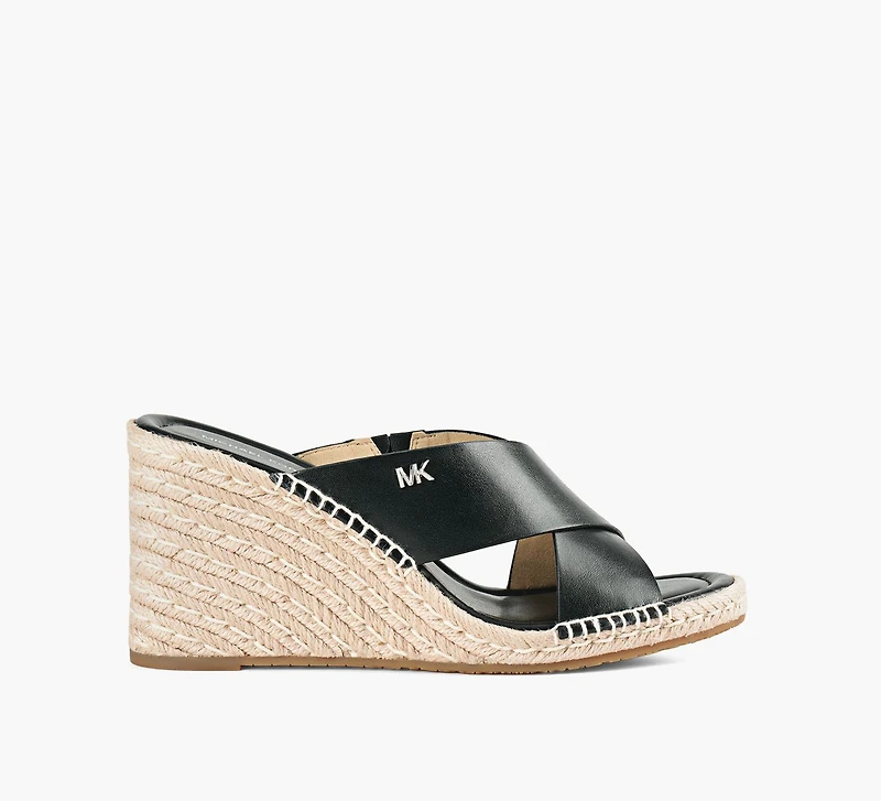 Bold style for sunny days. The Michael Kors Kenzie Wedge sandals feature a sleek tonal upper accented with a refined metallic logo for a modern finish. A padded footbed delivers lasting comfort, while the cross-over straps ensure a secure fit. Perfect for elevating summer outfits with effortless sophistication.
