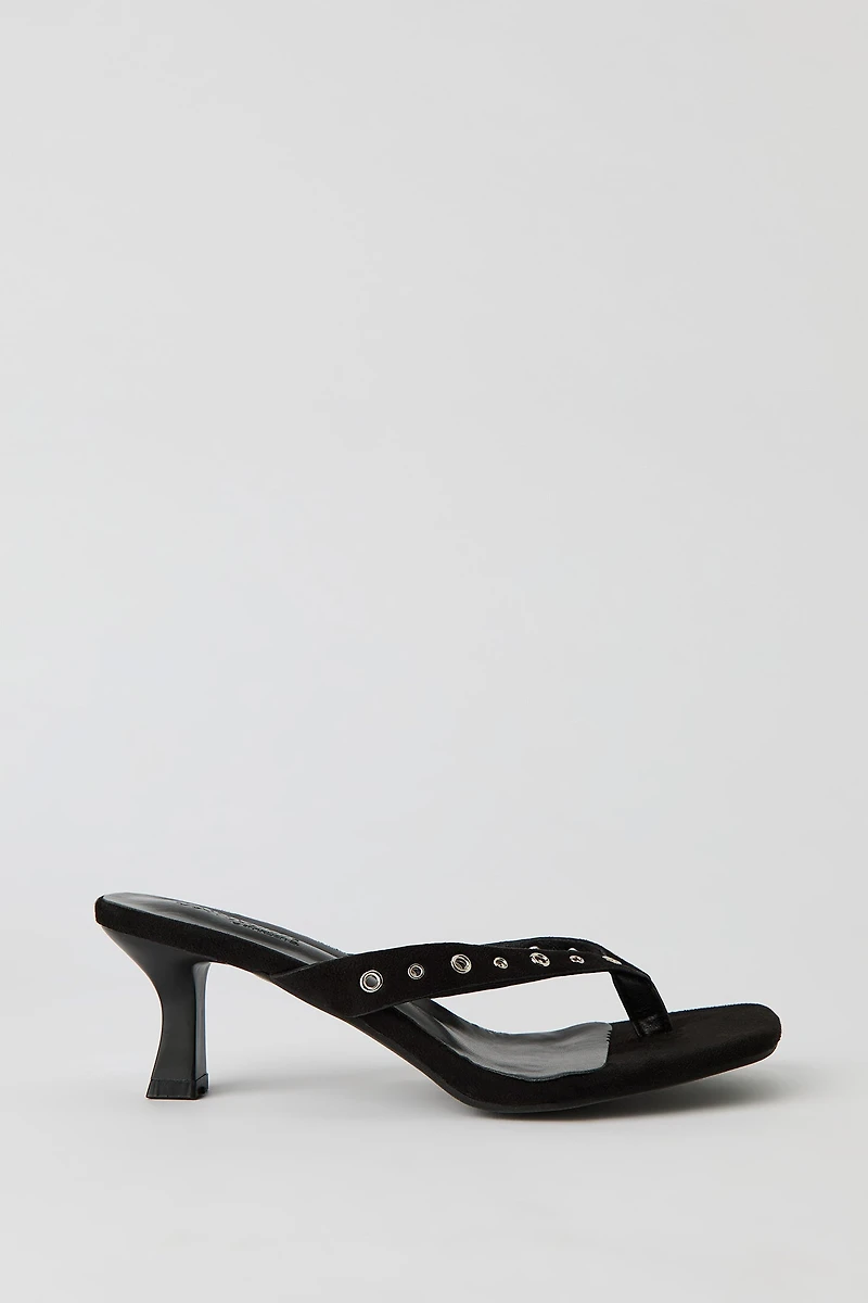 This shoe features open toe strap, kitten heel and thong construction. Imported