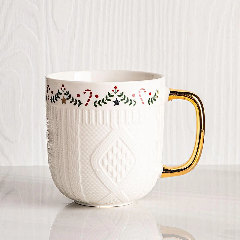 Sit and sip by the fireplace with the KSP Christmas Sweater Knit Ceramic Mug. Featuring a cozy knit texture, trendy gold handle, and classic 'Garland' motifs, it is the perfect choice for your hot coffee or tea.