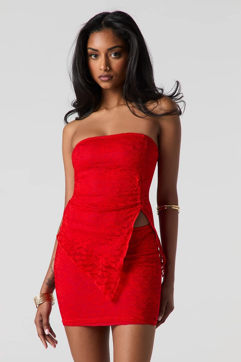 This skirt features lace material, elastic waist and mini length. Pair with our Lace Self-Tie Side Cinched Asymmetrical Tube Top to complete the look.