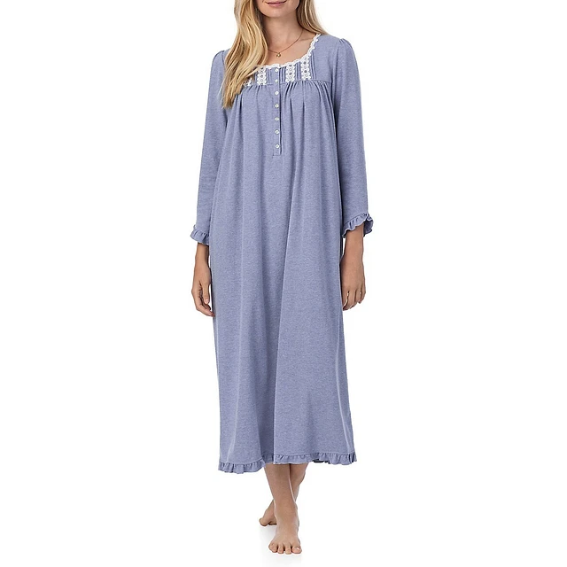 Lace-Trim Jersey Long-Sleeve Midi Nightgown