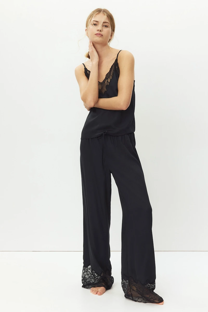 Pajama pants in softly draped viscose satin. Elasticized, drawstring waistband and wide lace trim at hems.