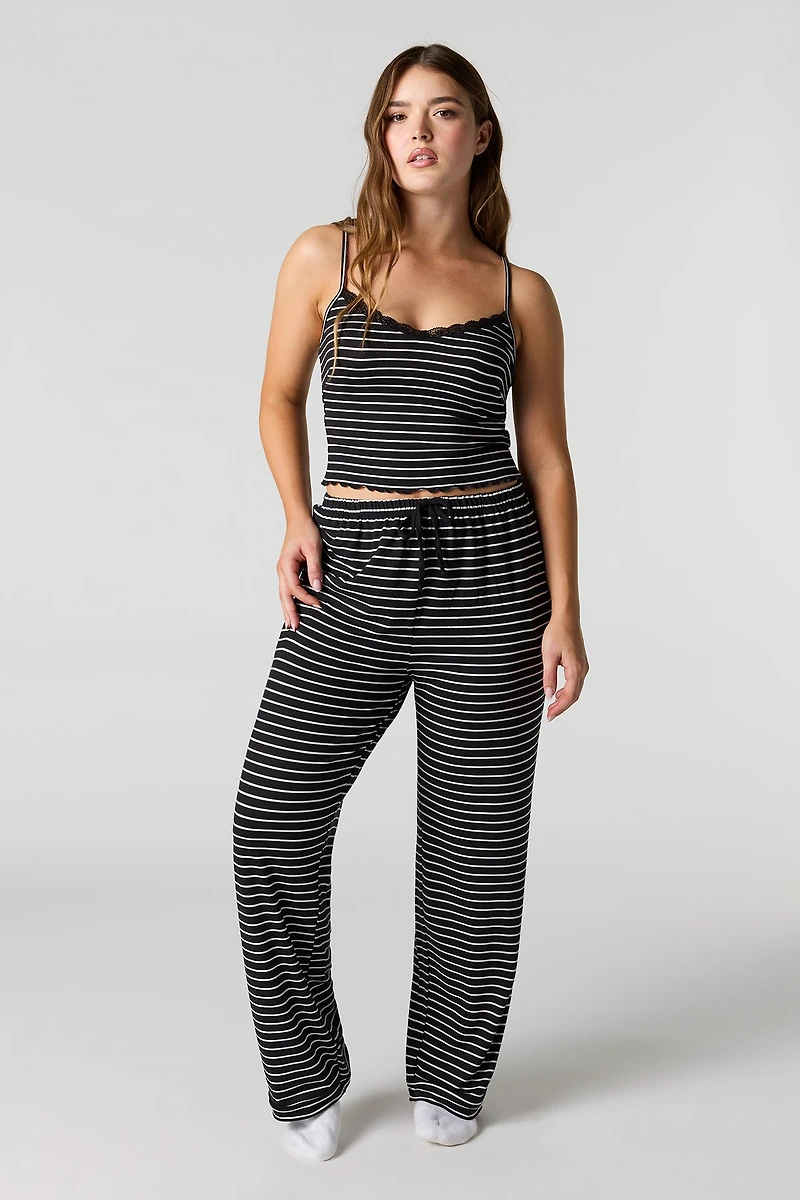 This set comes with a top featuring soft material, lace v-neckline, adjustable straps, lettuce edge hem and matching pant featuring soft material, slide-in pockets and drawstring waist. Model: 5'9" in a size S 92% Polyester 5% Spandex Machine Wash in Cold Water - Gentle Cycle with Like Colours - No Bleach - Lay Flat to Dry - Low Iron Imported