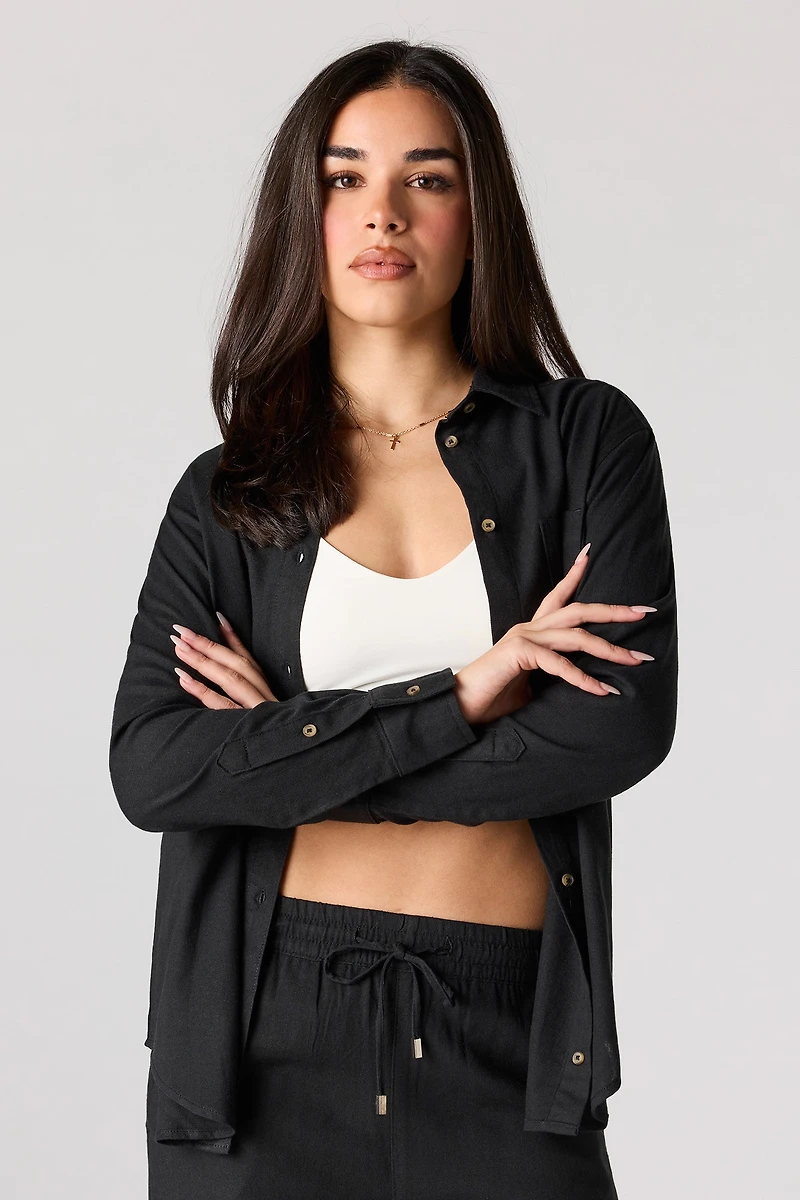 This top features collared neckline, button-up front, chest pocket, long sleeves, buttoned cuffs, and boyfriend fit. Pair with our Linen-Blend Wide Leg Pant & Linen-Blend Drawstring Short to complete the look. Model: 5'9" in a size S 70% Rayon 30% Linen Machine Wash in Cold Water - Gentle Cycle with Like Colours - No Bleach - Hang to Dry - Low Iron Imported