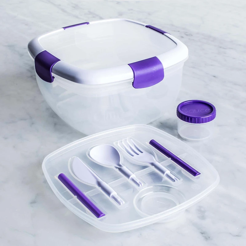 - Large salad compartment, cutlery compartment, dressing container and divided section