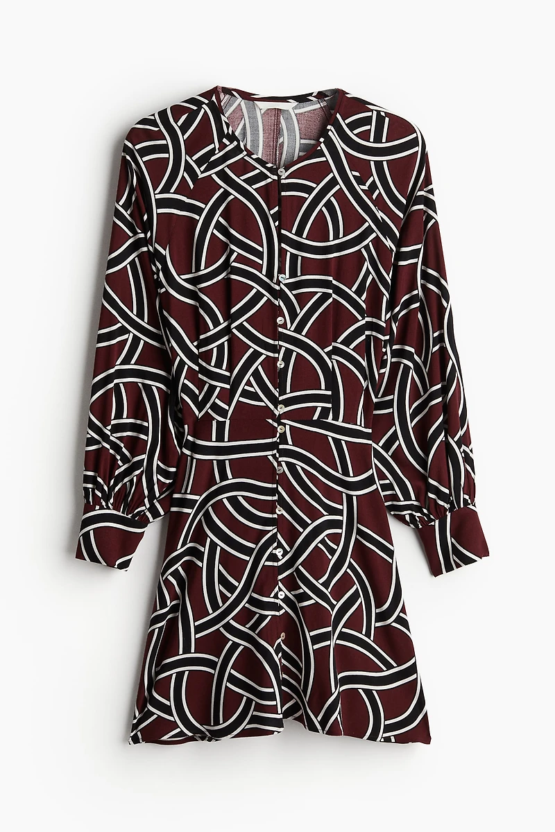 Short dress in woven fabric. Round neckline, pleats and buttons at front, long raglan sleeves, and wide cuffs with slit and button. Narrow elastic at back of waist and gently flared skirt. Unlined.