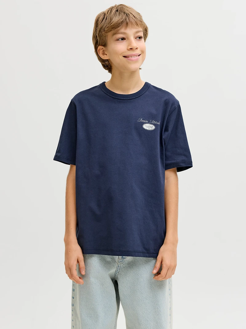 It doesn't get any simpler than a T-shirt. You'll be able to wear it with anything from your closet. Combed jersey is stretchy and has a soft feel, perfect for everyday wear. Discover the cool world of Jack and Jones Junior, where fashion comes alive with a burst of youthful energy and vibrant charm. Our collections are a blend of fresh, trendy, and cool designs tailored to fit boys aged 8-16. Immerse yourself in high-quality, comfortable styles that highlight boys’ fashion. From cool fits to contemporary flair, Jack and Jones Junior redefines fashion for ages 8-16 and embraces the spirit of adulthood into every outfit. - Product Type : T-shirt - Neck : Round neck - Sleeve : Long sleeves - Print : Rubber print for a soft feel - Fit : Loose Fit