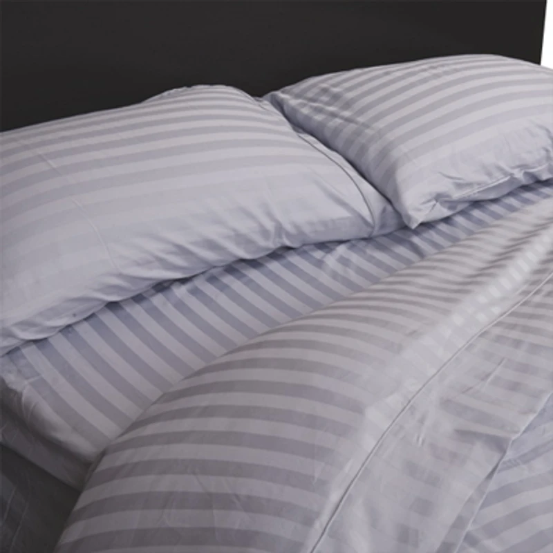 Enjoy a luxurious night's sleep with this Damask Stripe sheet set from Maholi. It features a double-sized flat sheet, fitted sheet, and two standard-sized pillow shams made from 300 thread count Egyptian cotton. Supple and breathable, these beautiful sheets will complement any bedroom décor. | Maholi Damask Stripe Collection 300 Thread Count Egyptian Cotton Duvet Cover Set - Double - Sky Blue