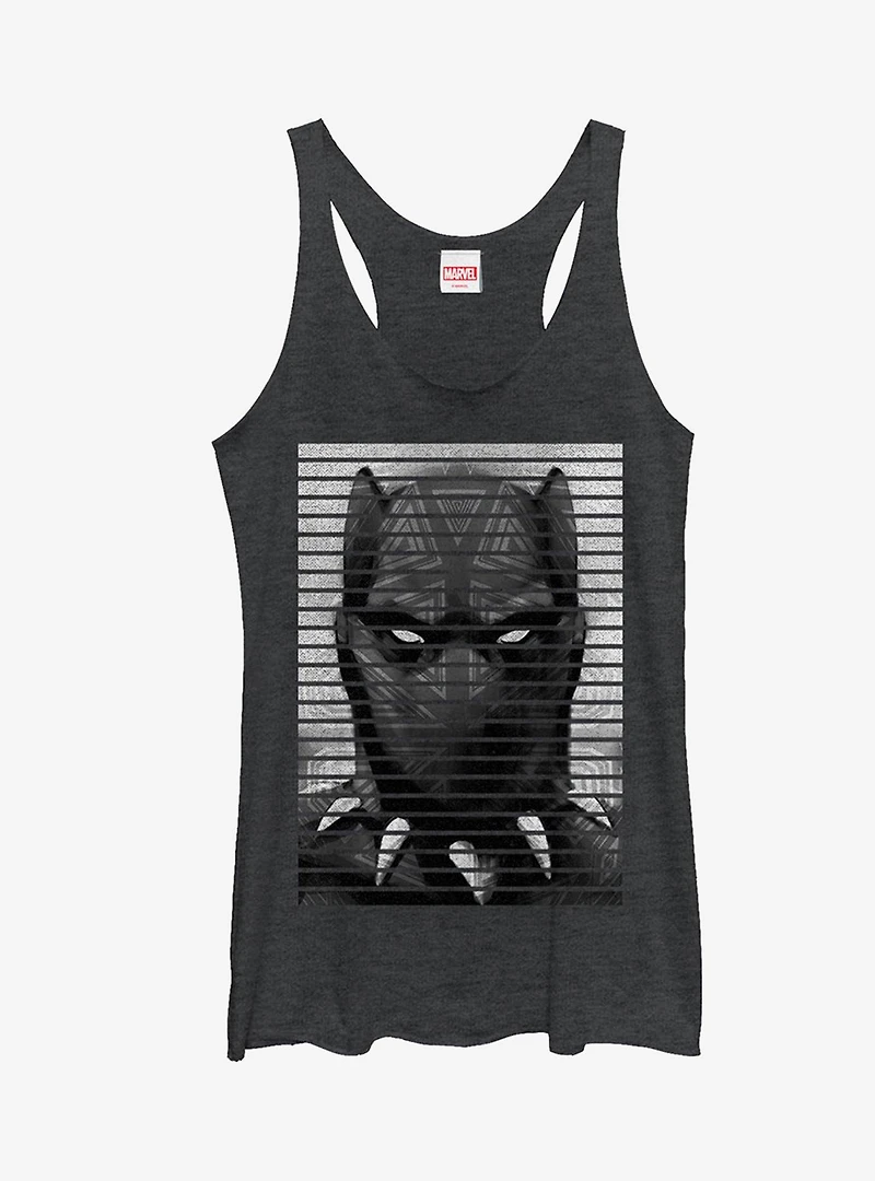 The Black Panther has all sorts of hidden talents but did you know that great fashion like the Marvel Black Panther Striped Profile Women's Racerback Tank Top was one of them?! Distressed white stripes shape the Wakandan King's face on this classic black and white print Black Panther tank top.