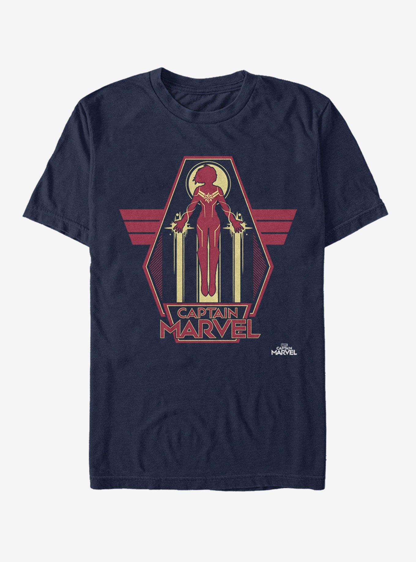 Higher. Higherrrrr. HIGHER!!! Captain Marvel takes flight on the front of this navy T-shirt.